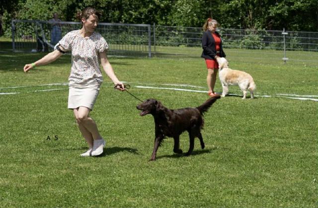 "3 years liver, excellent proportions and balance, very good movement and carriage, feminine head, which needs a little more chiseling in front of the eyes, a touch too long in the couplings, she is a very honest true type flatcoat which a lot to like."