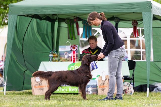 "2 Jahre alte leberbraune Hündin, femininer Kopf, vorzügliche Größe, langer Hals, etwas steiler Oberarm, vorzügl. Brustkorb, obere Linie gerade, etwas lange Lenden, korrekt angesetzte und getragene Rute, vorzügliche Füße, in der Bewegung zeigt sie guten Vortritt und Schub, vorzügliches Haarkleid."