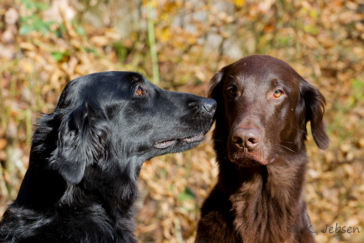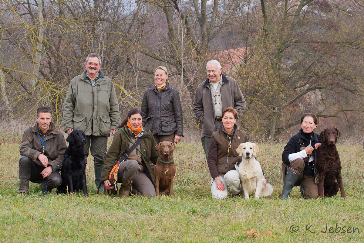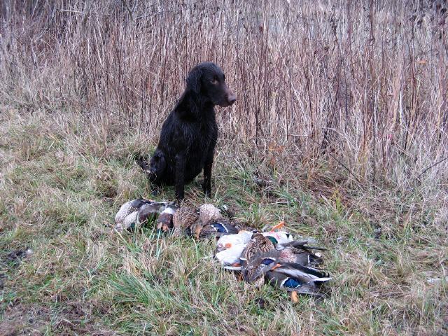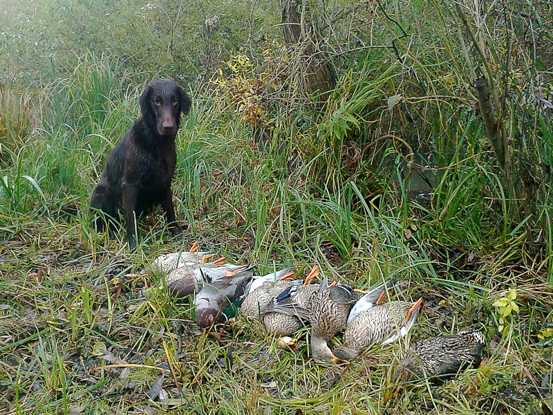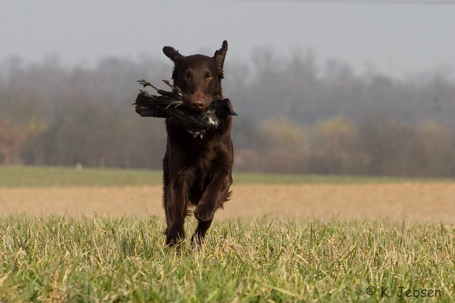 24. November 2011: Unsere Jagdsaison - Zwar waren wir seit Anfang September einige Male auf Krähen, aber unsere Jagdsaison startete erst so richtig am 1. November mit einer kleinen Treibjagd in Brühl. Kristofs und Jacks Beitrag zur Strecke waren 1 (2) Hasen, 2 (6) Fasane und 1 (1) Taube. Zwei Wochen später waren die beiden zum ersten Mal zu einem Picking Up auf Enten im Elsaß eingeladen. Jack war dort der einzigste Flat. Er konnte an diesem Tag 25 Enten arbeiten, darunter auch einige lebende. Für eine 15-minütige Arbeit an einer angebleiten Ente, die auf offener Wasserfläche immer wieder abtauchte und die Jack nach ausdauerndem Hinterherstellen, nachdem sie sich endlich in den Uferbewuchs drückte, ergreifen konnte und unversehrt zu Kristof brachte, erntete er Beifall und Bewunderung für seine gute Arbeit von dem umstehenden Schützen! Das war ein toller Moment und sowohl Kristof als auch Jack konnten an diesem Tag viele neue Eindrücke sammeln. Gestern waren wir wieder auf Treibjagd in Brühl. Trotz dichtem Nebel konnten diesmal 2 (2) Hasen und 5 (3) Fasane zur Strecke gebracht werden. Wir wissen, dass nicht viele so eine Jagdmöglichkeit mit ihrem Retriever haben und sind dafür sehr dankbar!