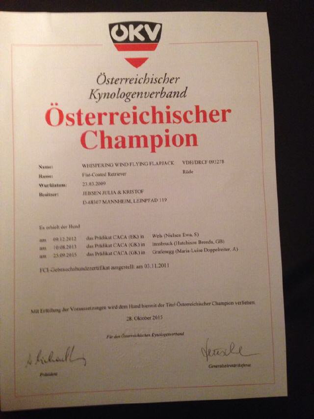 29. September 2015: Der Crazy-Trip nach Österreich hat sich gelohnt! Wir sind gleich mit 2 Champions nach Hause gekommen. Unser Gast "Ginger" konnte den Titel, wie Jack auch, vervollständigen. Juhuu!! Ella erhielt auf dem Retriever Festival Grafenegg ein Vorzüglich und auf der IHA Tulln ein V4.