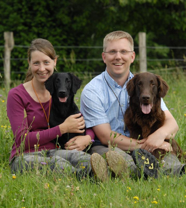 We decided for a flatcoat, because of their happy temperament, intelligence and working ability paired with an elegance that is unique among retrievers. We spend much of our time working and playing with our dogs. As Flatcoated Retrievers are an intelligent breed with a strong desire to work, they need something important to do, so we do dummy training, participate in workingstests and go hunting (primarily birds and small game), which is mainly Kristof's part.
