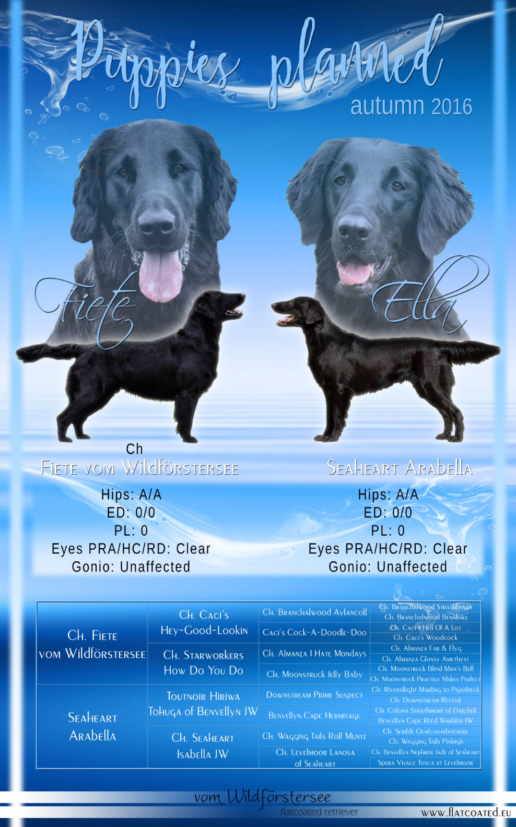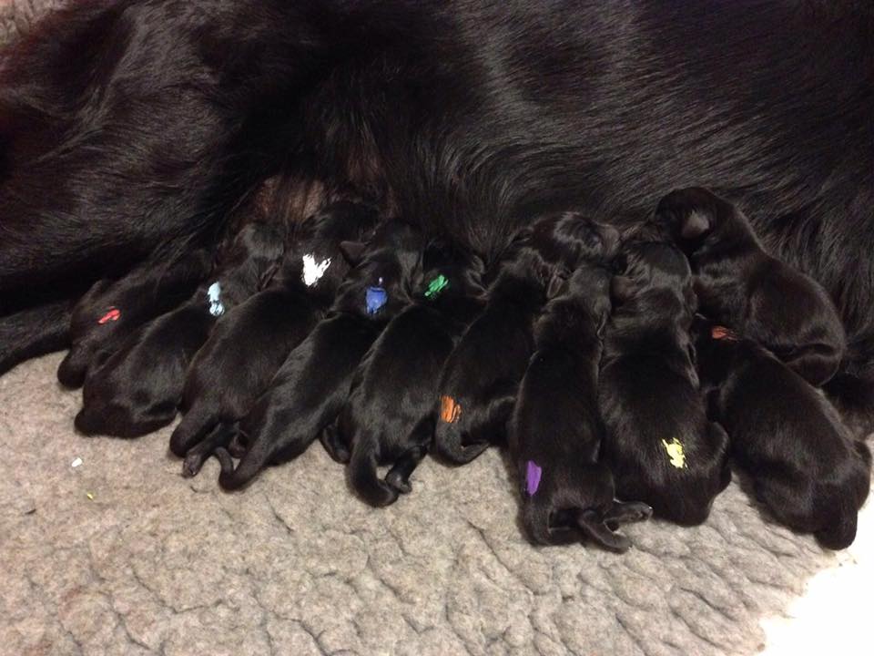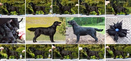 Ella wurde am 04.07. läufig und ab dem 11. bis zum 17. Tag der Läufigkeit von Fiete gedeckt. Die beiden waren äußerst verliebt. Beim Ultraschall am 11.08. waren 5-6 Fruchtanlagen zu sehen, so dass wir von einem normal großen Wurf ausgingen. Am 14.09. wurden 10 Welpen geboren, 5 Rüden und 5 Hündinnen, alle schwarz. Die Welpen können ab dem 09.11. abgegeben werden. Nähere Infos auch auf www.wildfoerstersee.eu