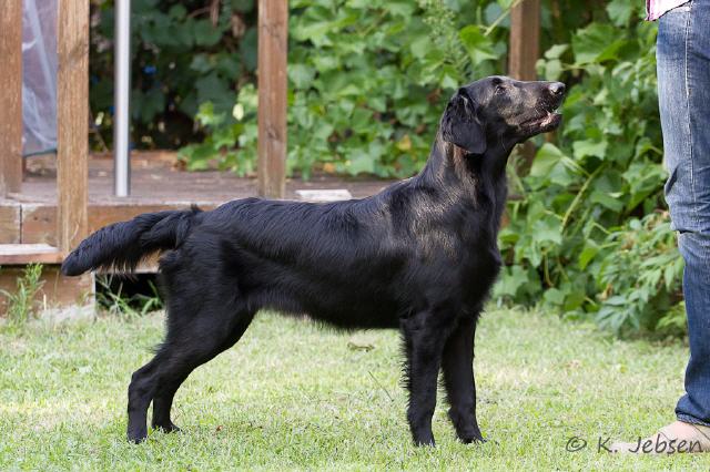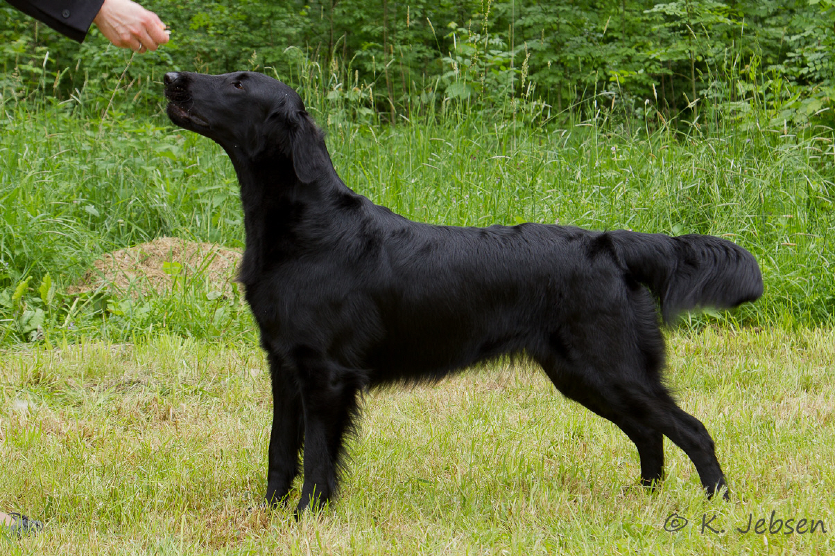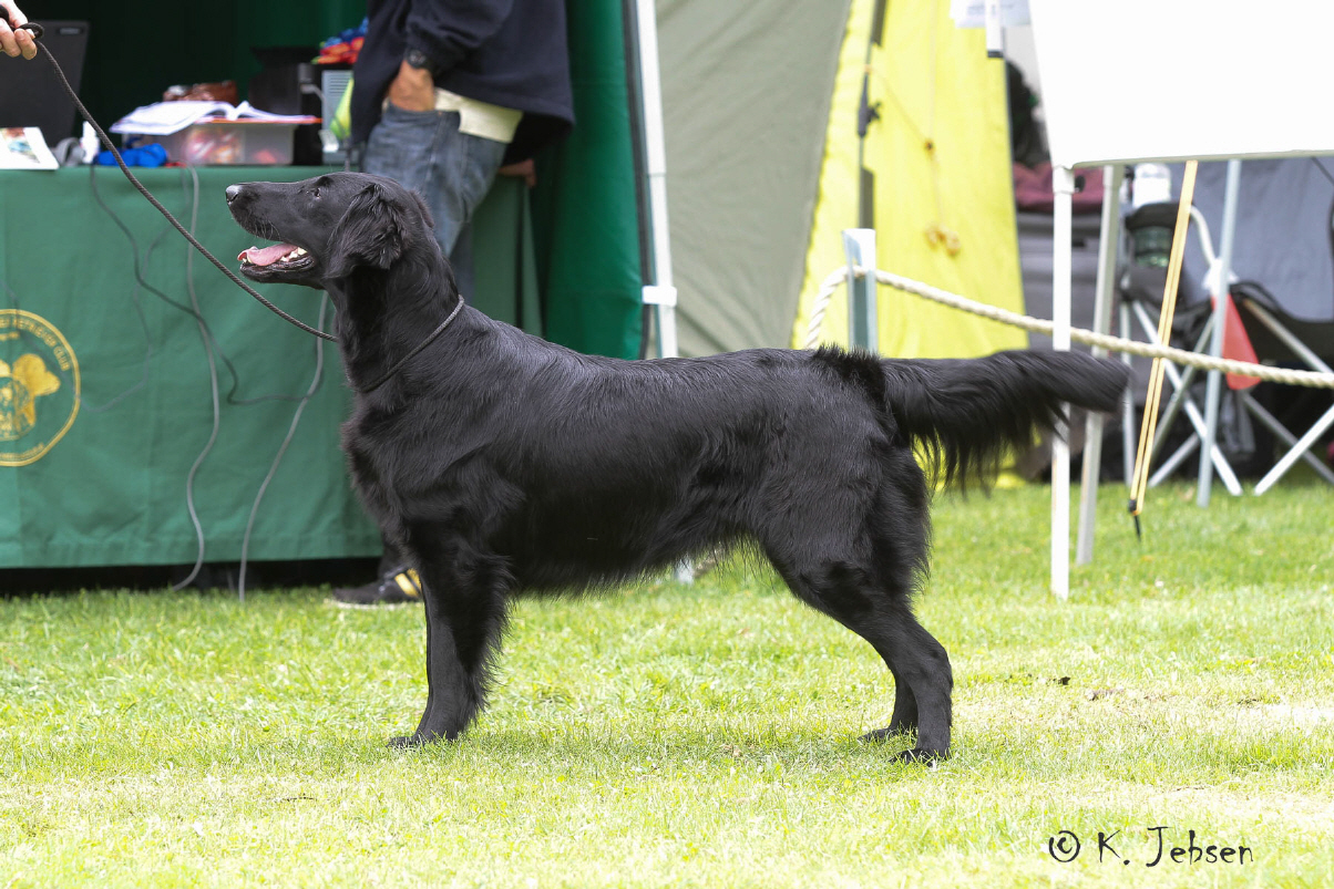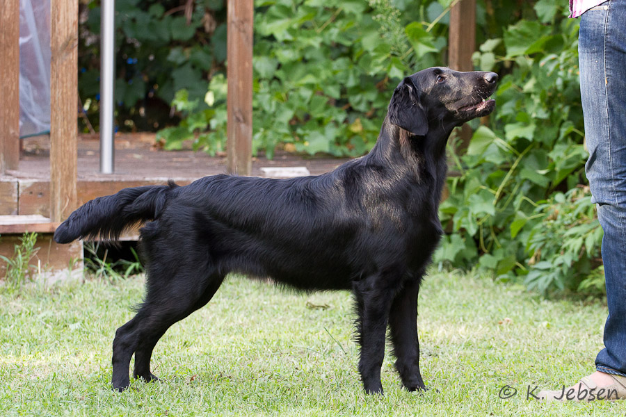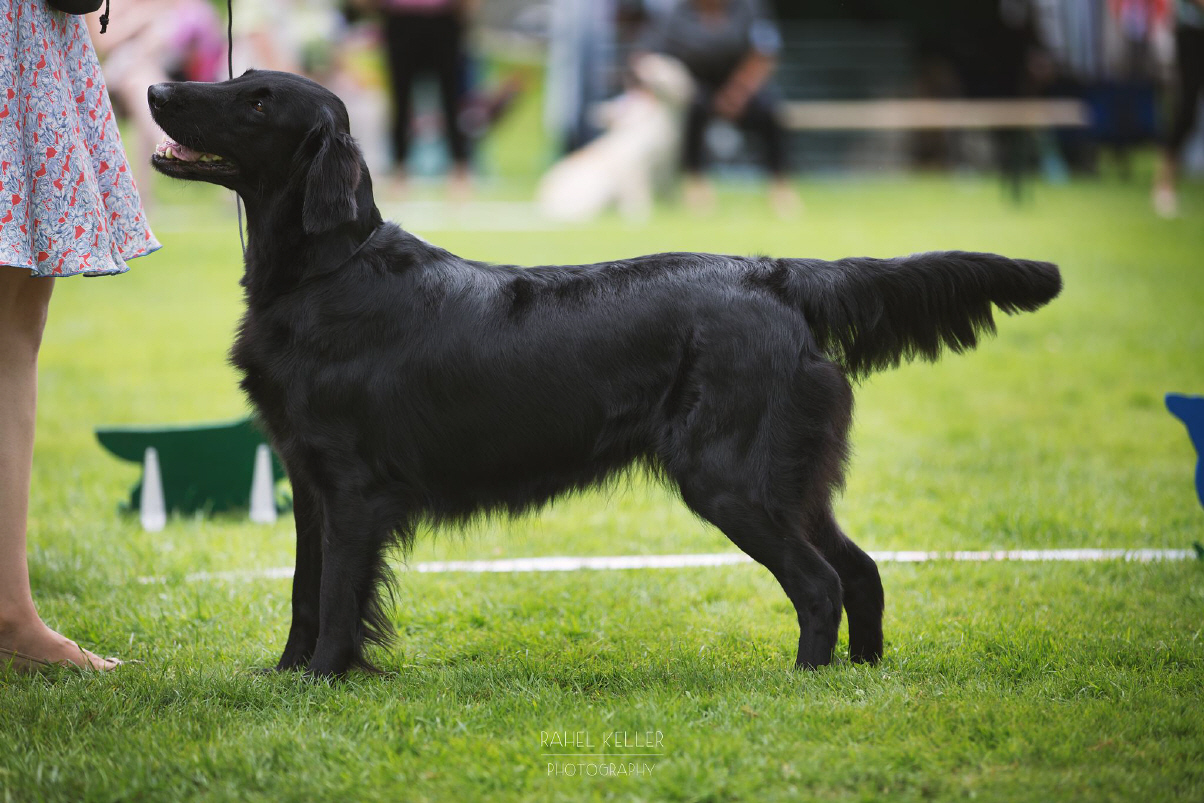"9 jährige freundliche Hündin in bester Kondition, mit femininem Kopf. Vorzügl. Halslänge, korrekte obere Linie und Rutenansatz. Korrekte Vorbrust mit Brusttiefe. Korr. Winkelungen. Vorzügl. Fellanlage. Im Stand bestens präsentiert. Bewegt sich flüssig. Flat-typisches Temperament."