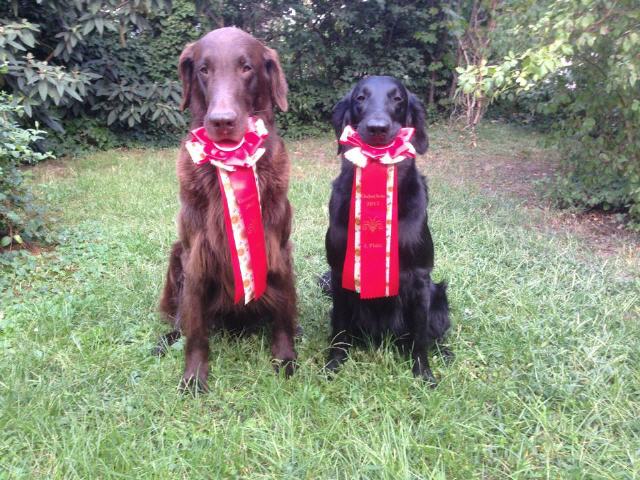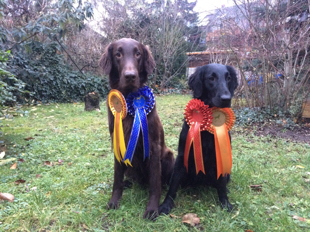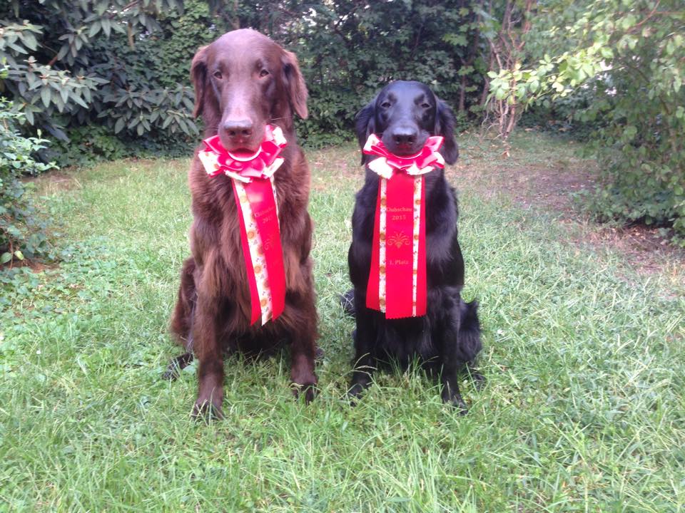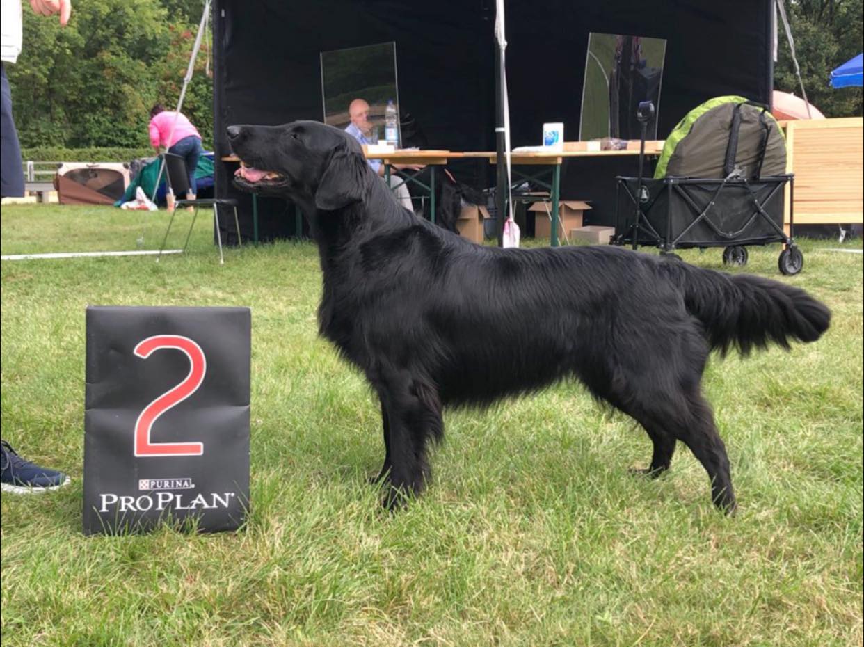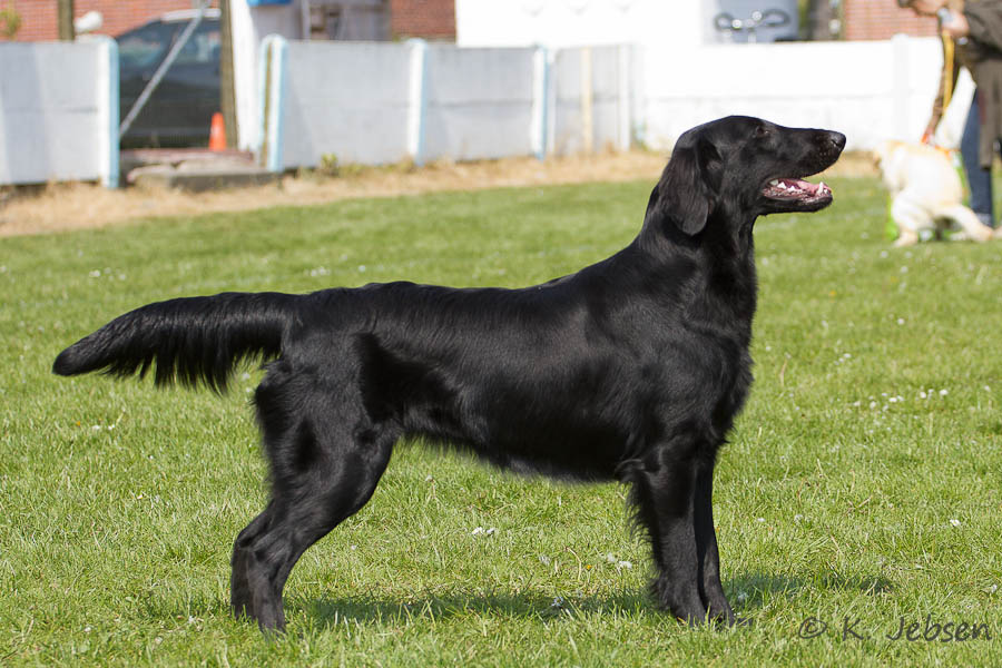 "9 jährige freundliche Hündin in bester Kondition, mit femininem Kopf. Vorzügl. Halslänge, korrekte obere Linie und Rutenansatz. Korrekte Vorbrust mit Brusttiefe. Korr. Winkelungen. Vorzügl. Fellanlage. Im Stand bestens präsentiert. Bewegt sich flüssig. Flat-typisches Temperament."
