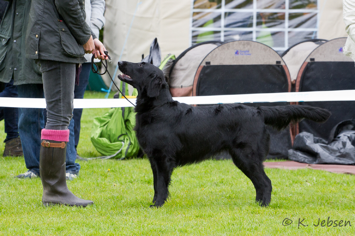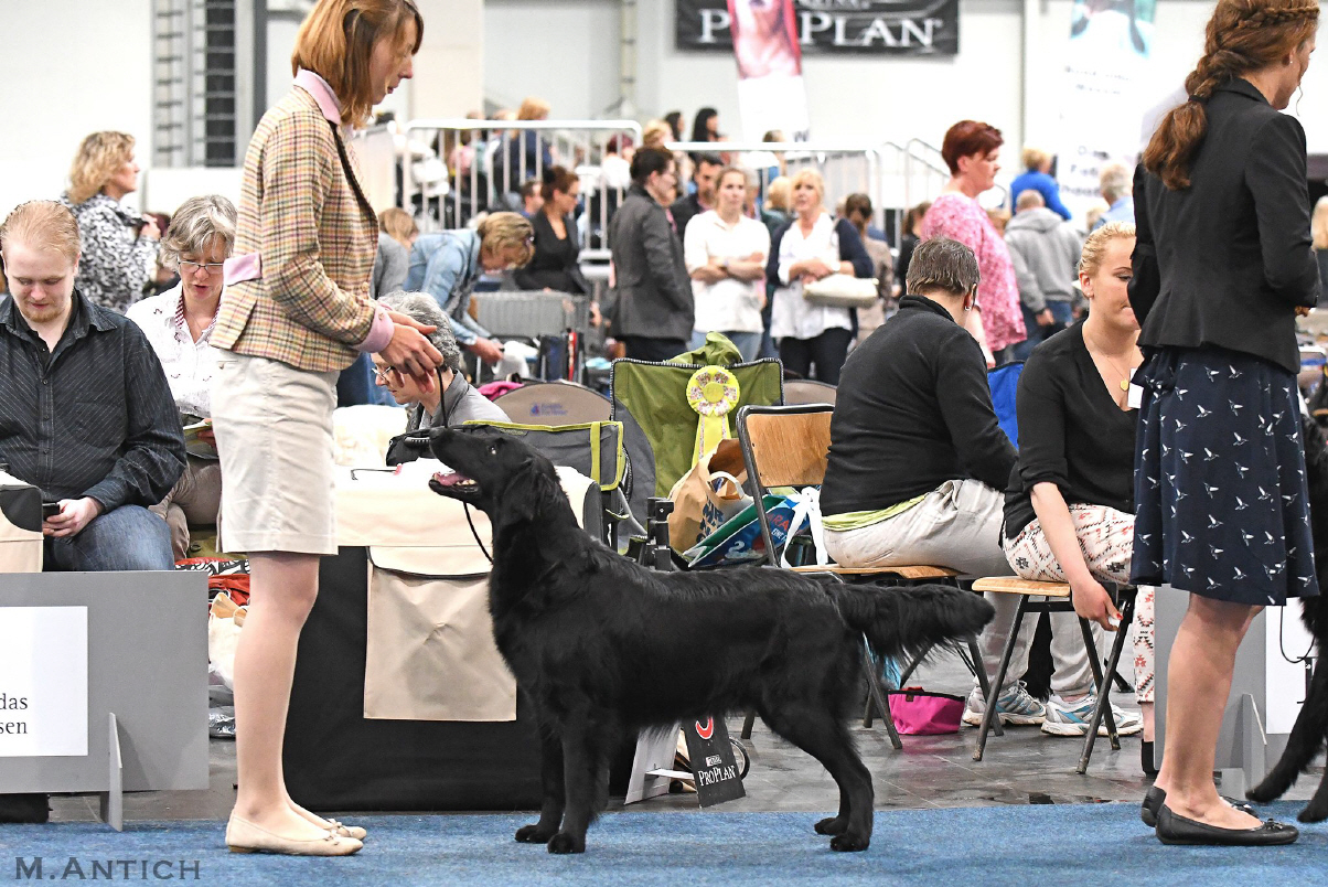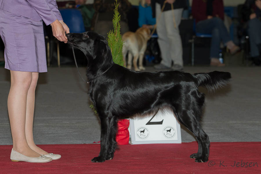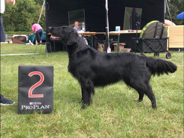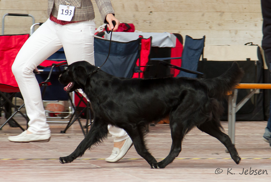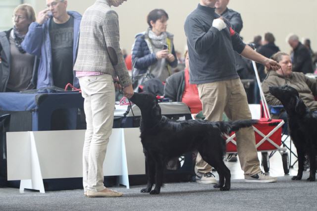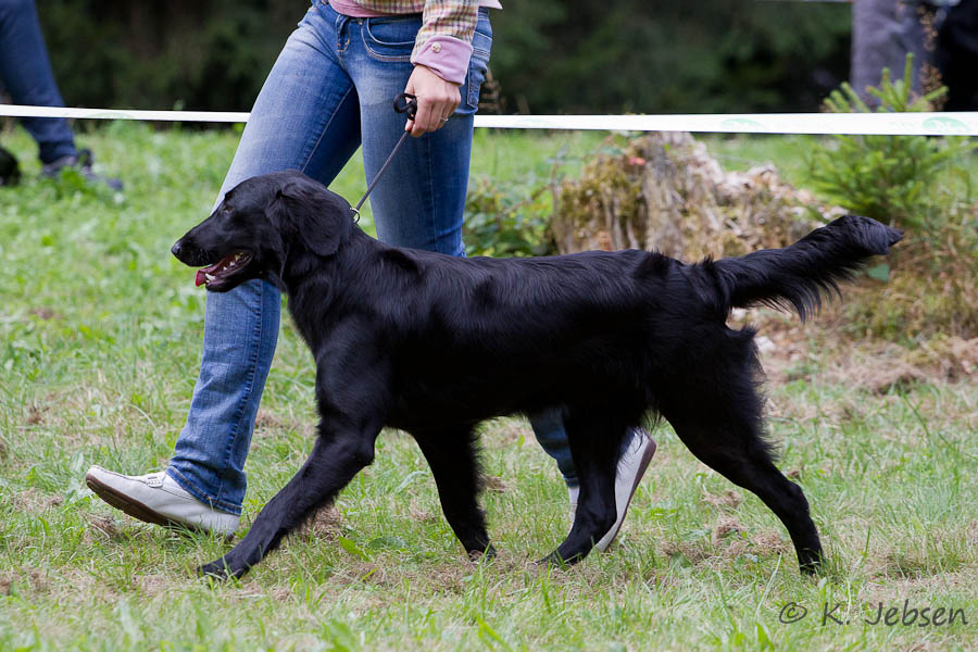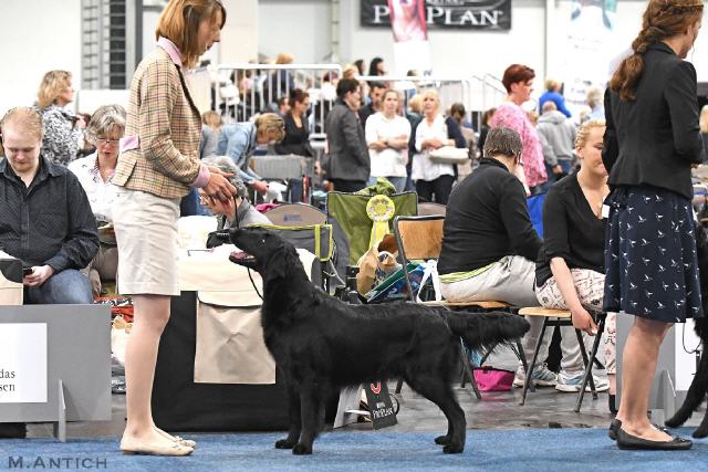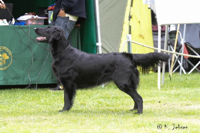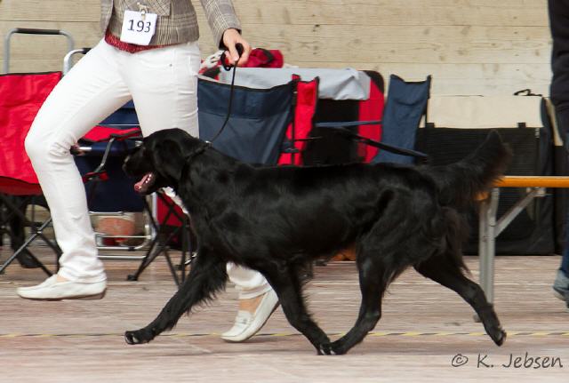 "lovely Flatcoat temperament, feminine beautiful head, exc. neck, a little bit round in topline, exc wagging tail, very good angulated in front and back, exc. body, forechest and coat, very good bone, exc. feet, parallel back, moving little bit loose in front, nicely from side."