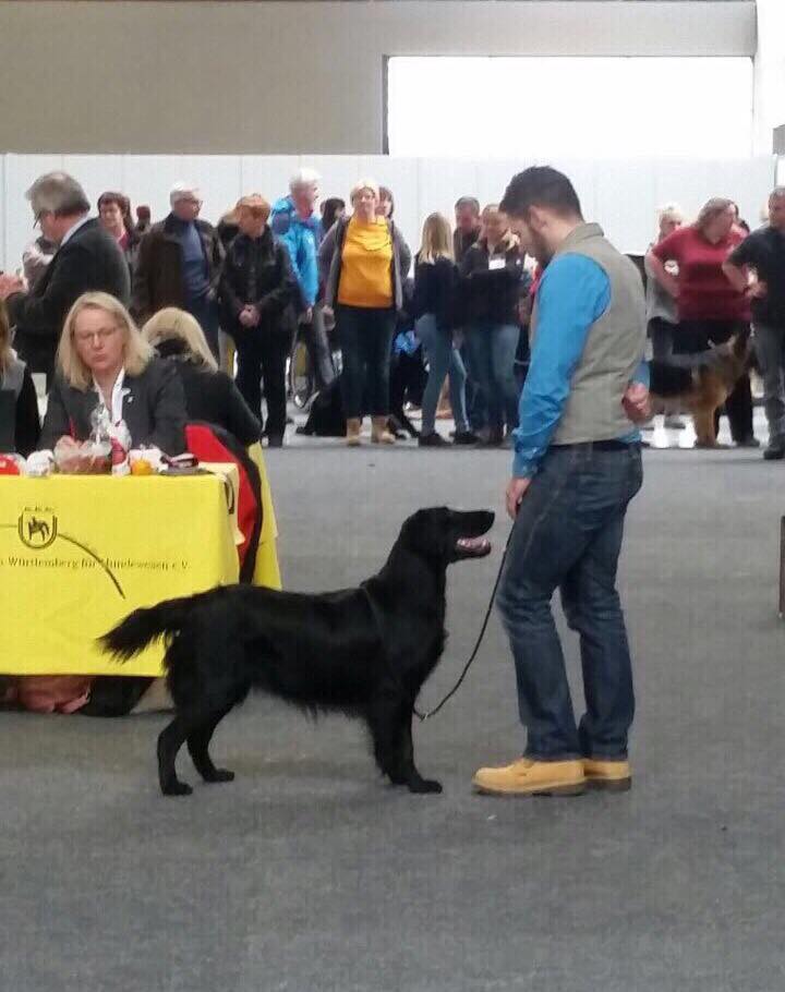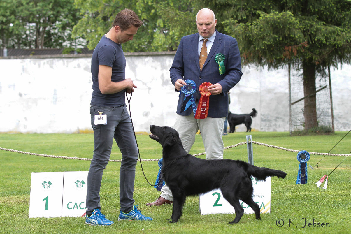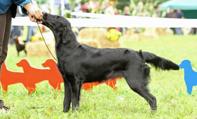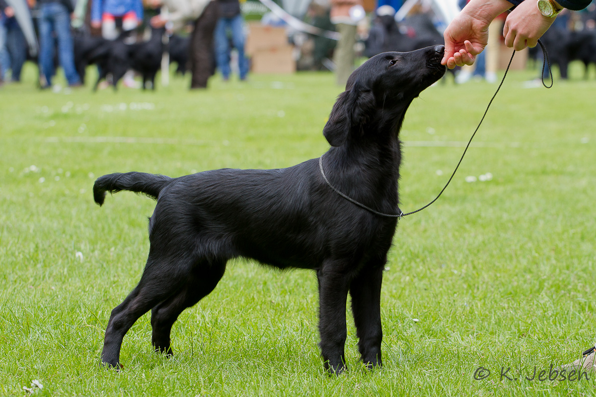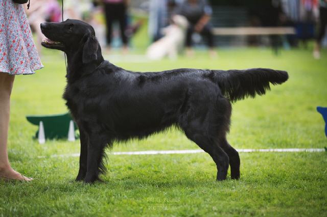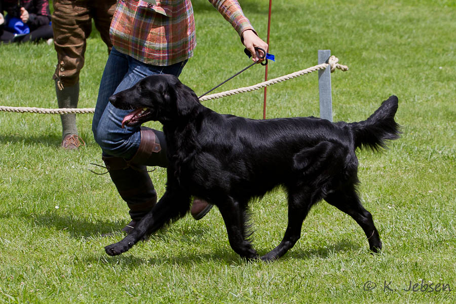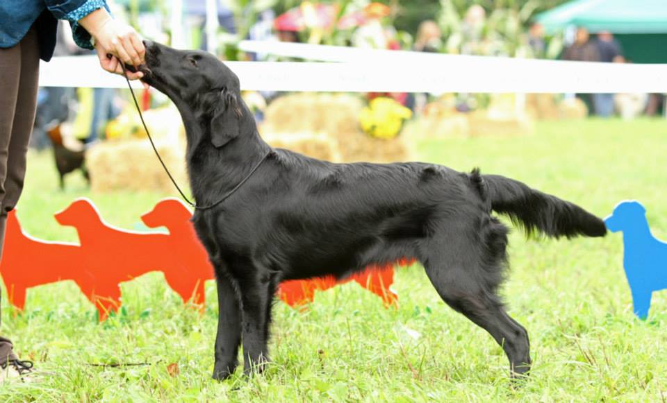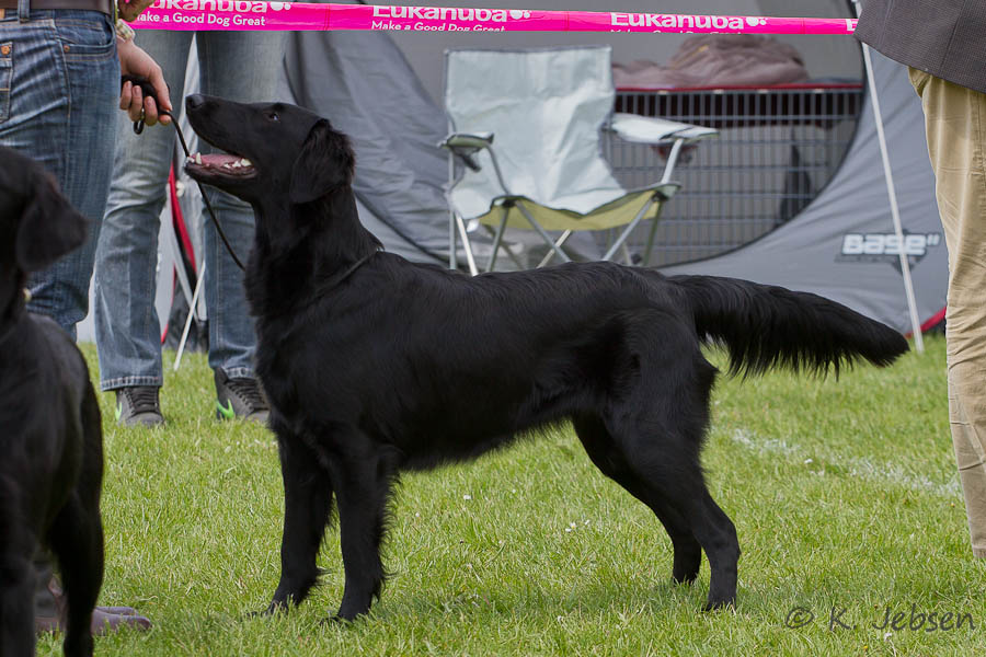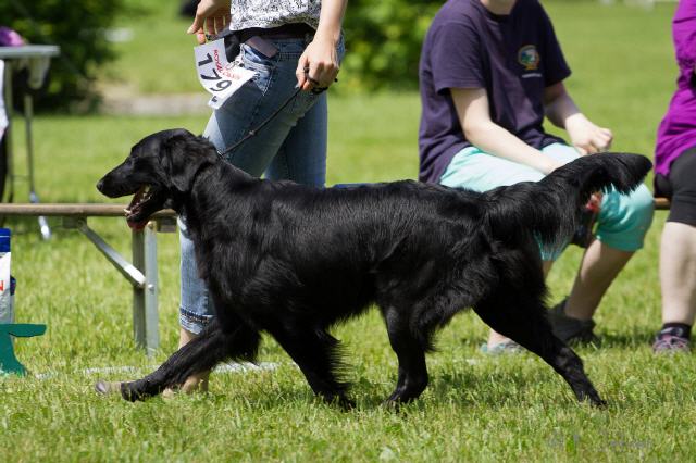 "lovely Flatcoat temperament, feminine beautiful head, exc. neck, a little bit round in topline, exc wagging tail, very good angulated in front and back, exc. body, forechest and coat, very good bone, exc. feet, parallel back, moving little bit loose in front, nicely from side."