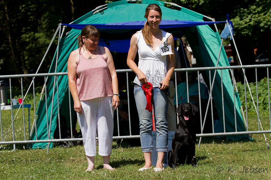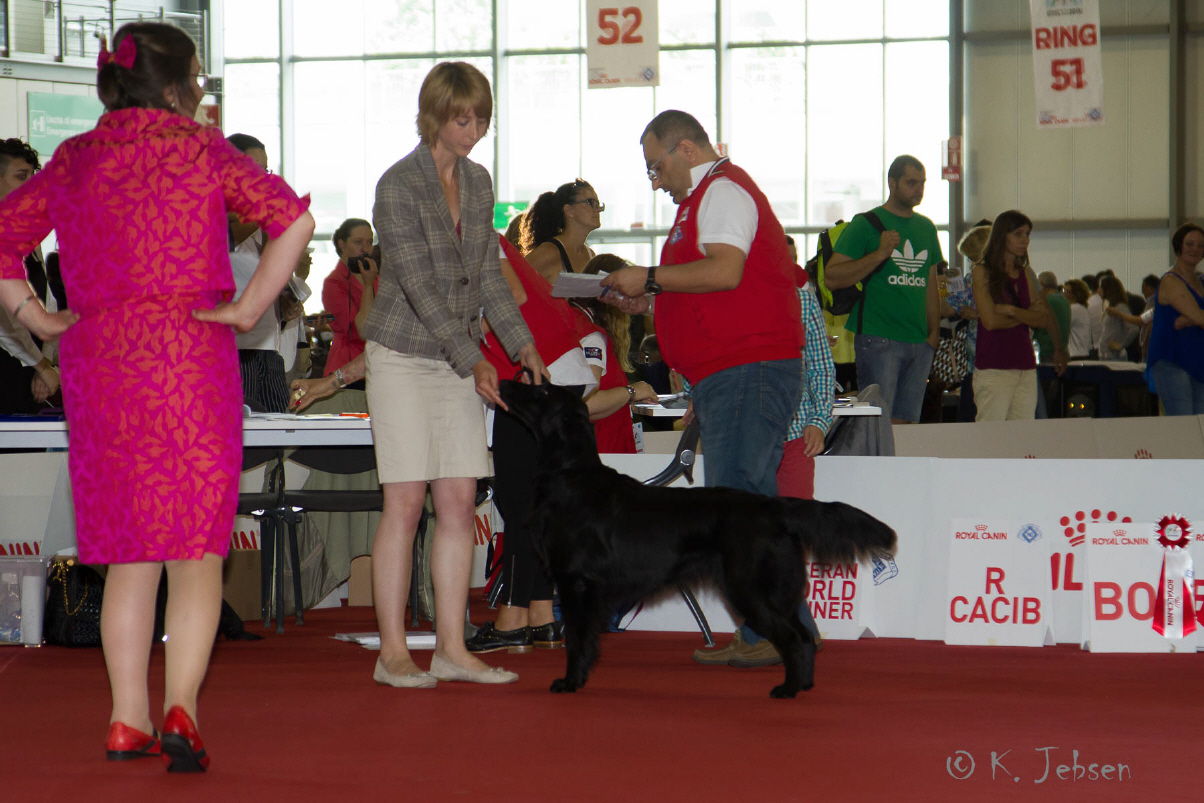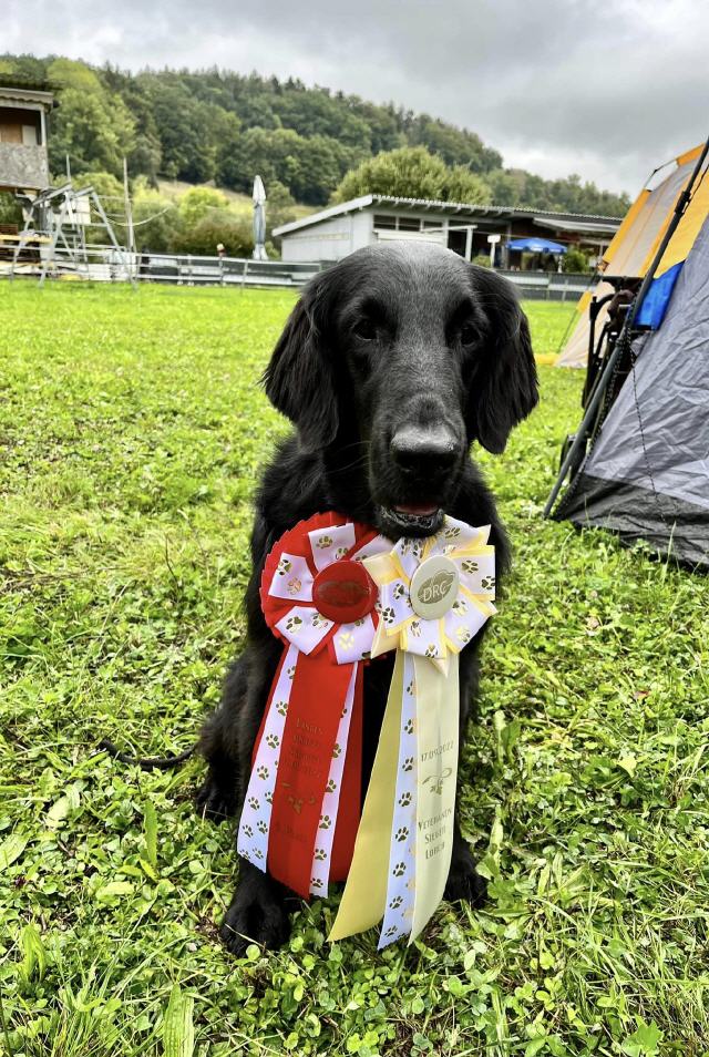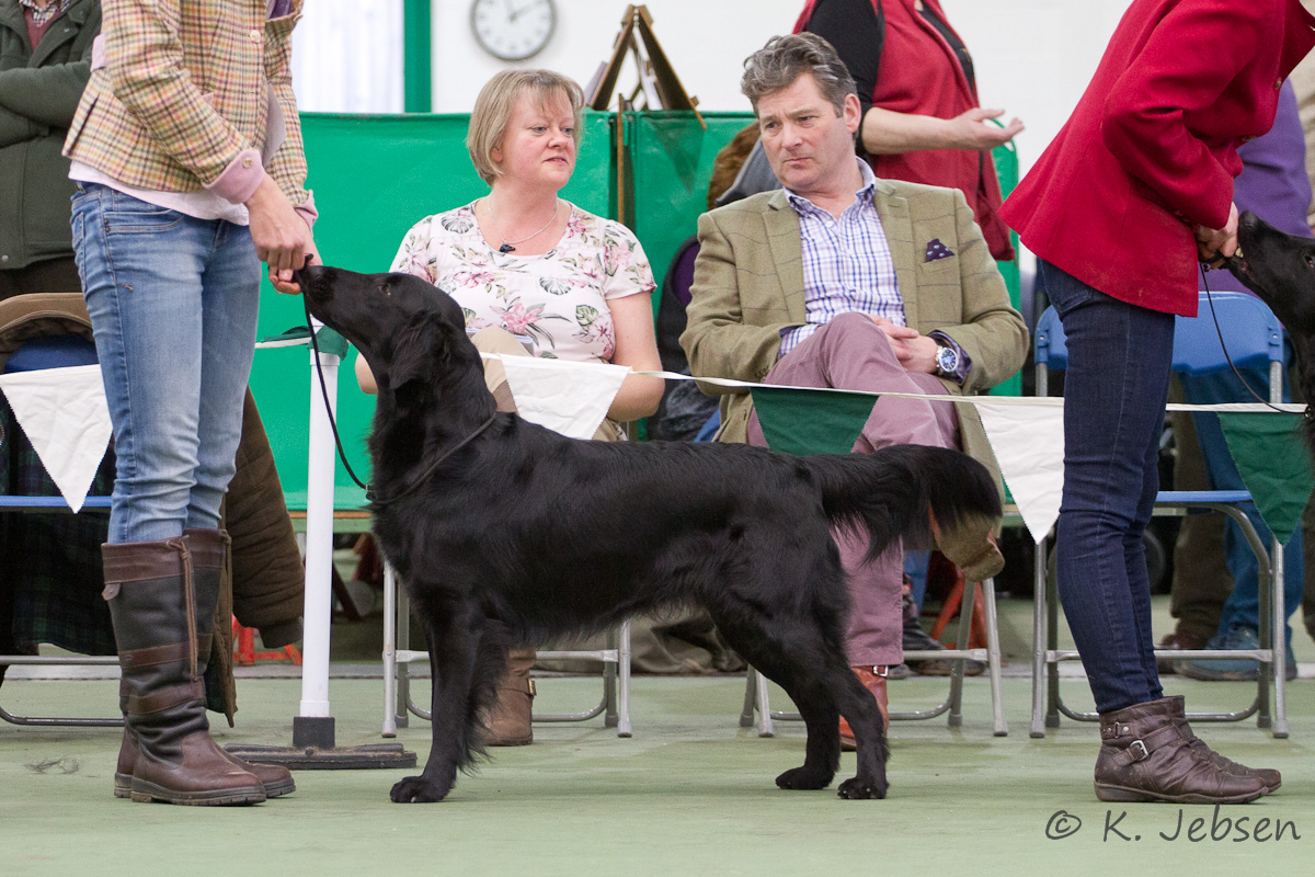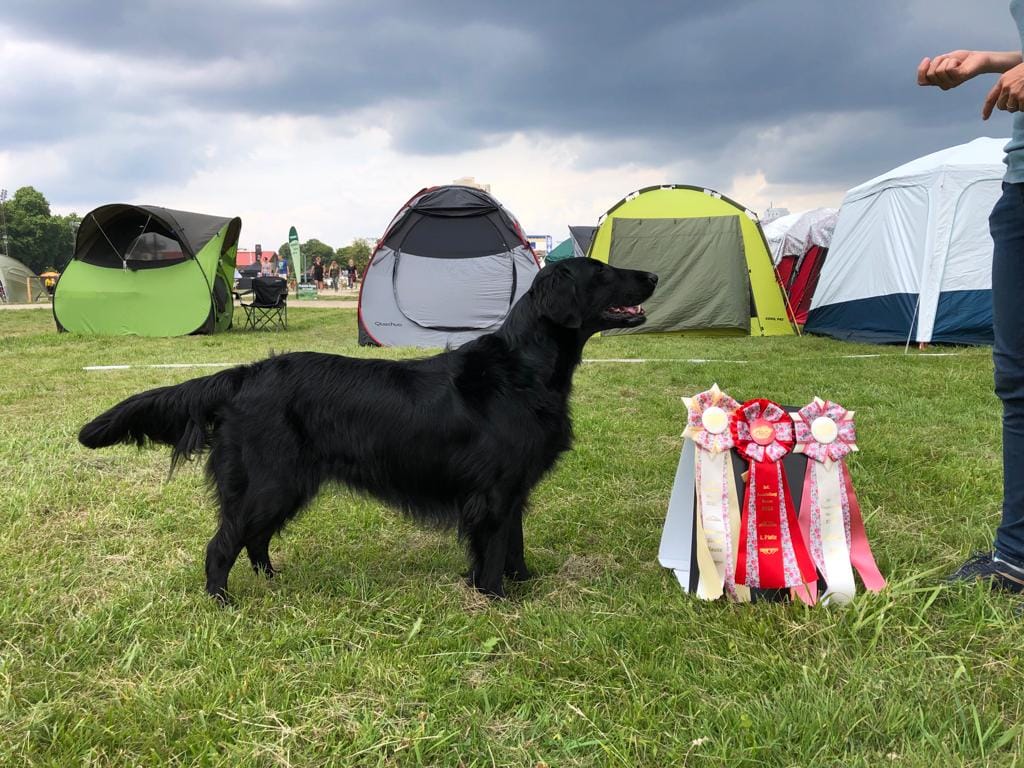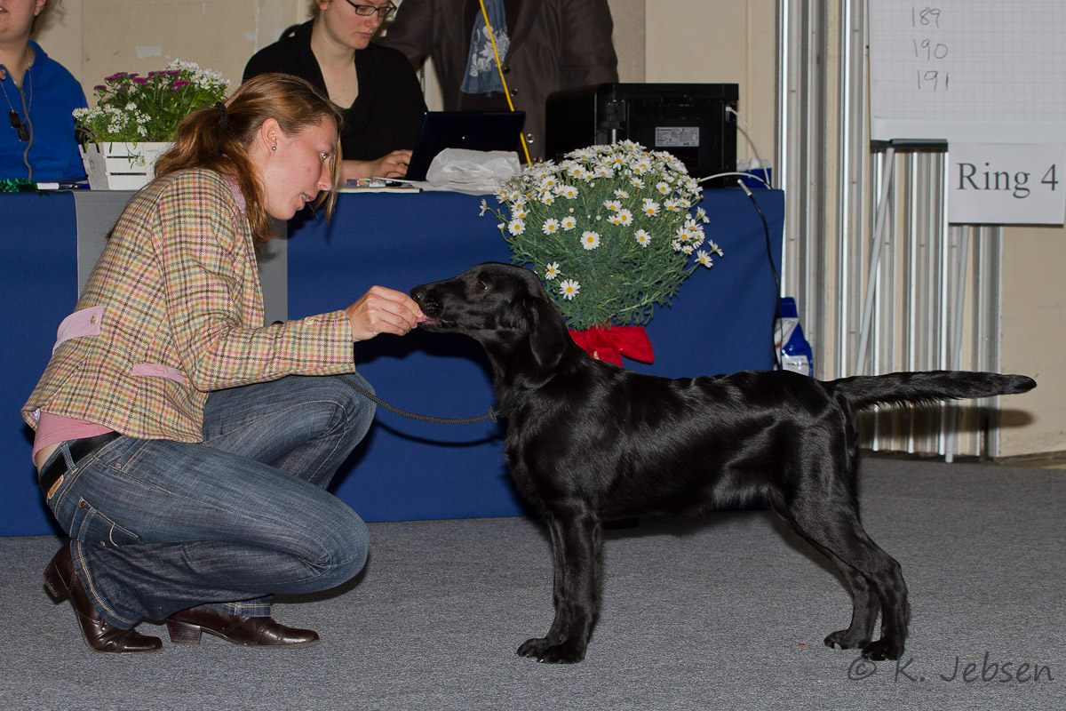 "lovely Flatcoat temperament, feminine beautiful head, exc. neck, a little bit round in topline, exc wagging tail, very good angulated in front and back, exc. body, forechest and coat, very good bone, exc. feet, parallel back, moving little bit loose in front, nicely from side."