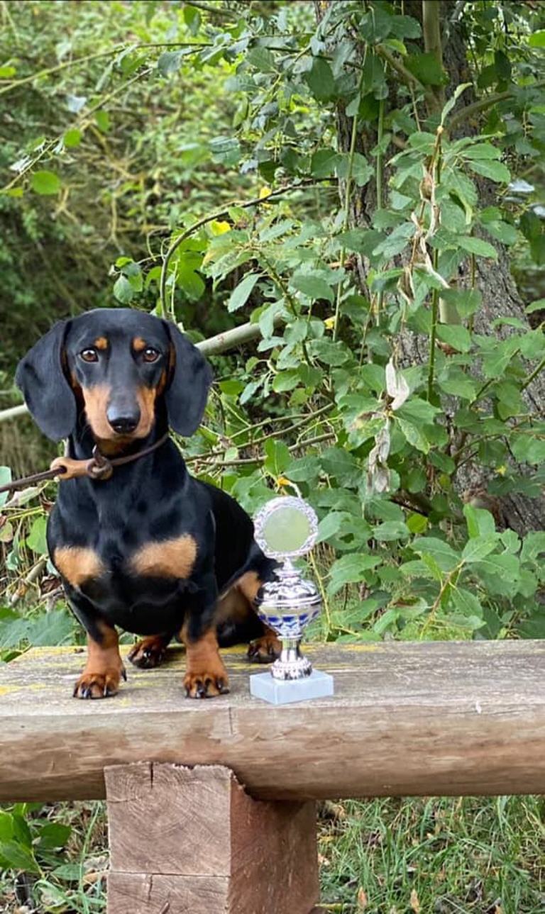 Spurlautprüfung 1. Preis, ESw Schwhk 1. Preis, BP Vorzüglich (Zuchtschau) 1x V1, CAC (VDH+DTK) 8R/4H nach Iltis vom Velbert *04.07.2021 3R/5H nach Quaste anne Pichten *08.08.2022 |