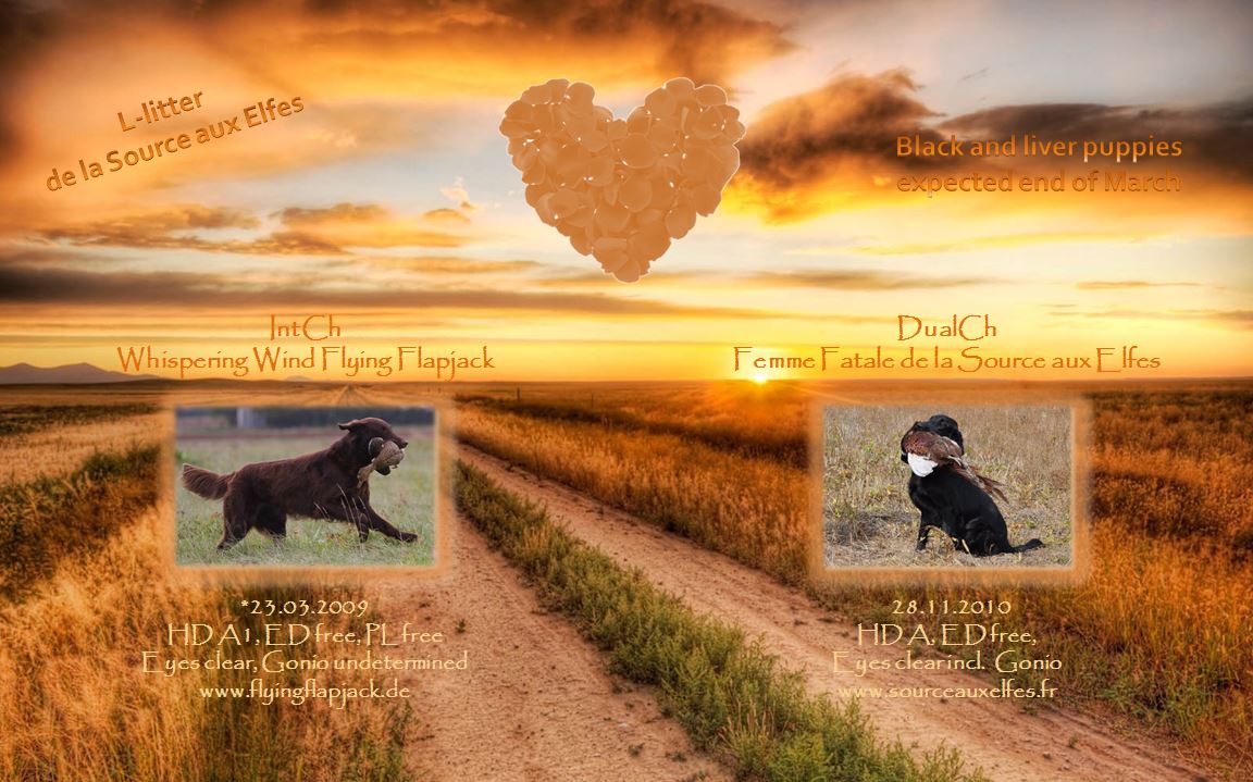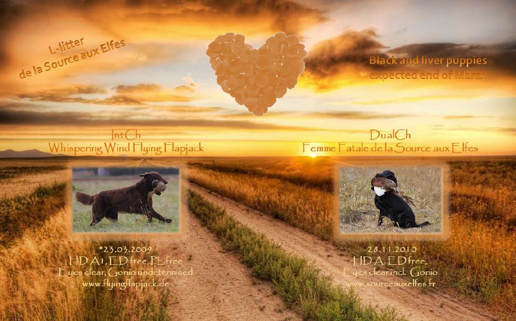 Wir freuen uns, dass Laurence Jack als ersten Partner für ihre Hündin Fée ausgesucht hat. Die beiden hatten am 22. und 23.01. ein Date. Der Ultraschall vom 18.02. bestätigte Fées Trächtigkeit mit einem großen Wurf. Am 23.03. (Jacks 6. Geburtstag) wurden die Welpen geboren. Es sind 6 Rüden und 4 Hündinnen, alle liver! Nähere Infos findet ihr auch auf www.sourceauxelfes.fr