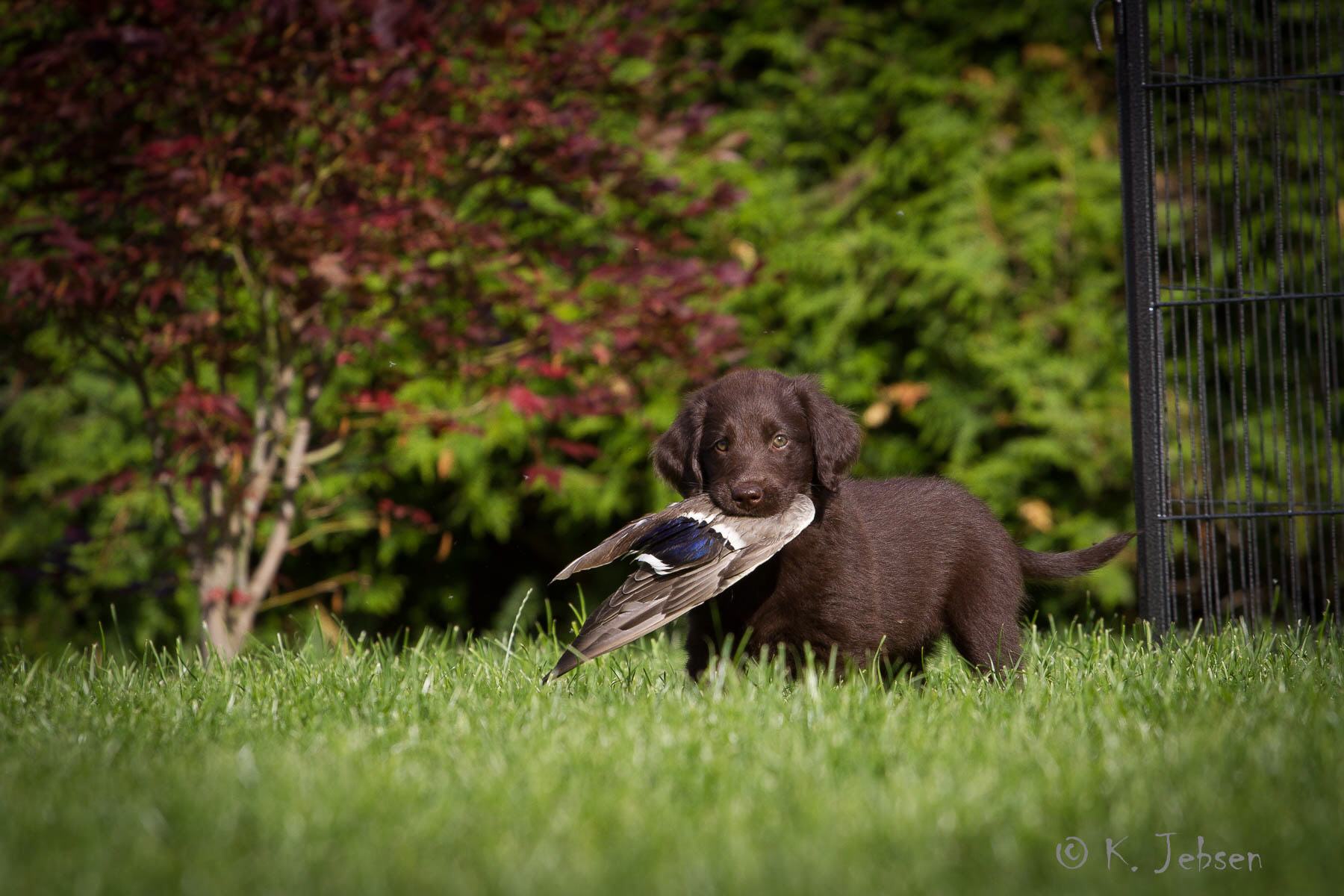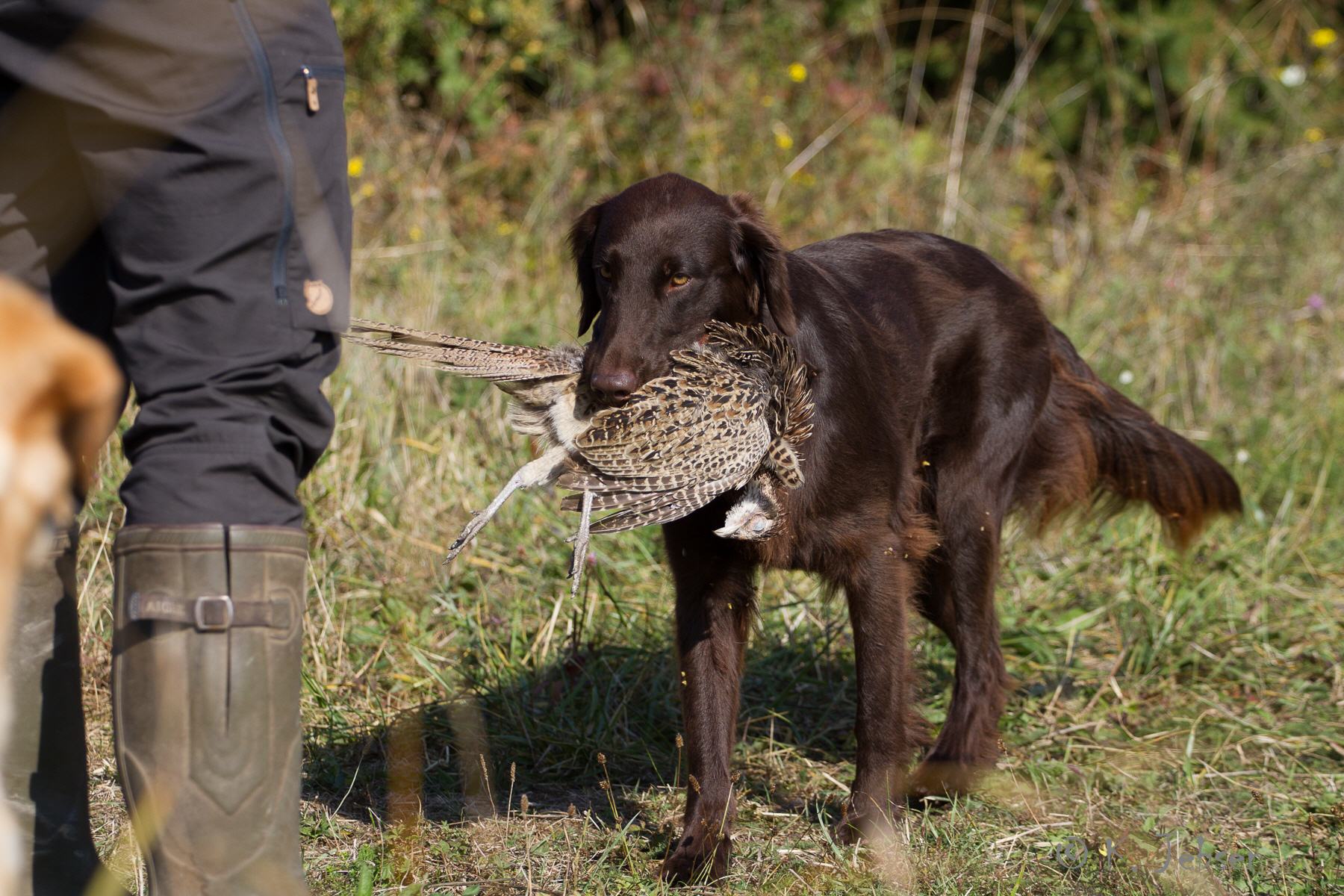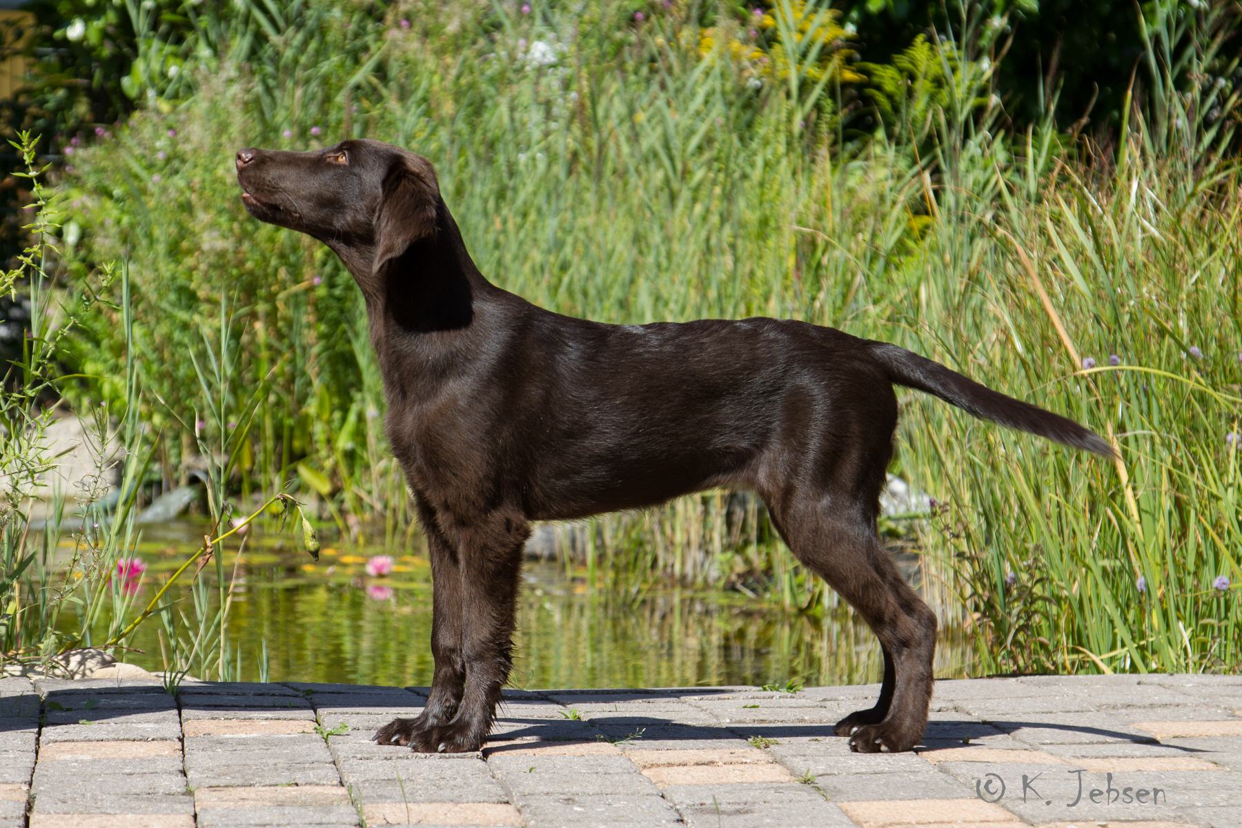 Von ihrer Art her ist Nala eher weich und verträgt keine strenge Unterordnung. Sie apportiert sowohl Dummies als auch alle Arten von Wild (außer Raubwild) bereitwillig und mit einer guten Schnelligkeit. Markieren und freie Suche sind ihre Stärken, wohingegen beim Einweisen mehr Training erforderlich ist. Optisch kommt Nala sehr nach ihrer Oma Whisper, außer dass sie liverfarben ist. Sie hat eine gute Größe und passende Knochenstärke, nicht zu helle Augen und ein schönes Gangwerk.